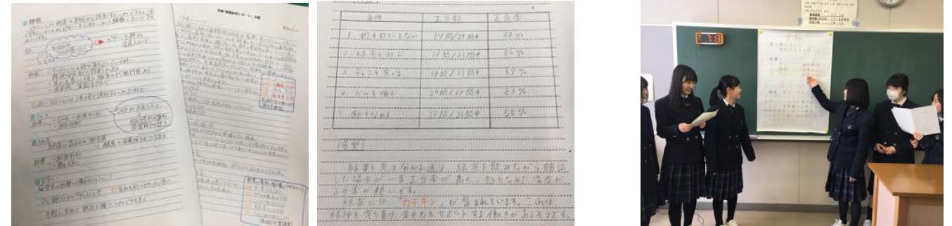 生徒に自身の健康や生活習慣と向き合わせるため、佐藤教諭の実践を参考に本校でも「人体実験レポート」を導入し、生徒に取り組ませてみました。 自分たちの知りたいことに合わせて実験内容・方法を考え、心身の変化や効果についてレポートを書いて提出させました。ただ、3週間個人で取り組み続けることは難しく、グループの仲間で同じ内容の実験に取り組み、それを合わせるという形をとりました。その後、結果や調べたことを模造紙にまとめ、授業時に発表を行いました。