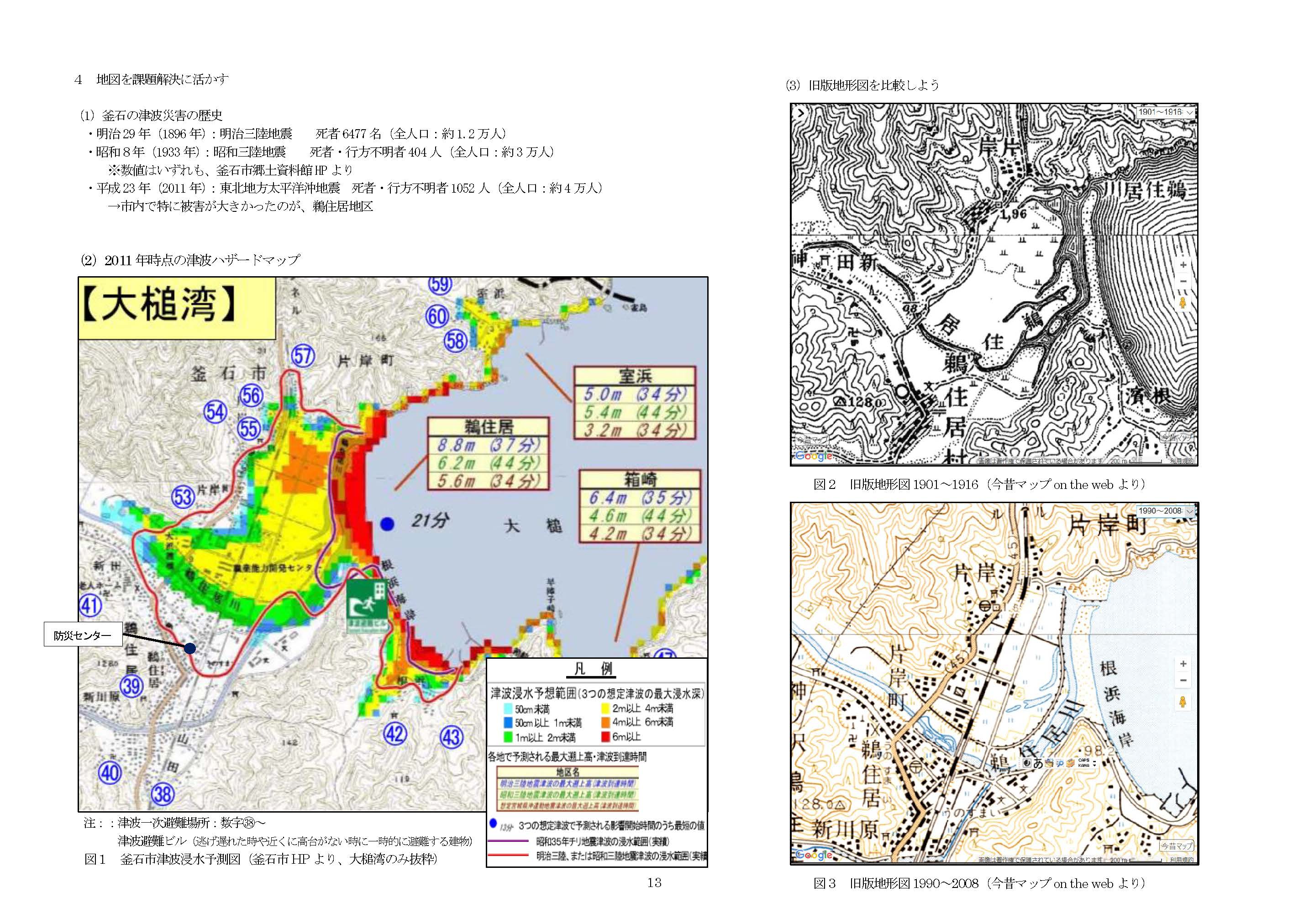 2018年度第2回SGH公開授業(2018.6.13実施) グローバル地理「地図を課題解決に活かす」 地図をどのように読むかによって災害を生き延びることができるか否かに違いが出ることを実感させ,学生の地図を読む力と防災意識を高めることが本実践の目的である。対象とした学生は,教員免許を取得中の大学3年生であり,科目は地歴公民だけでなく国語や英語など他教科を専門とする学生も含んでいる。将来教壇に立つ可能性がある学生同士がグループワークをしながら地図を読み,災害に向き合うことで,今後の防災・減災に向けた効果的な対策となると考えた。