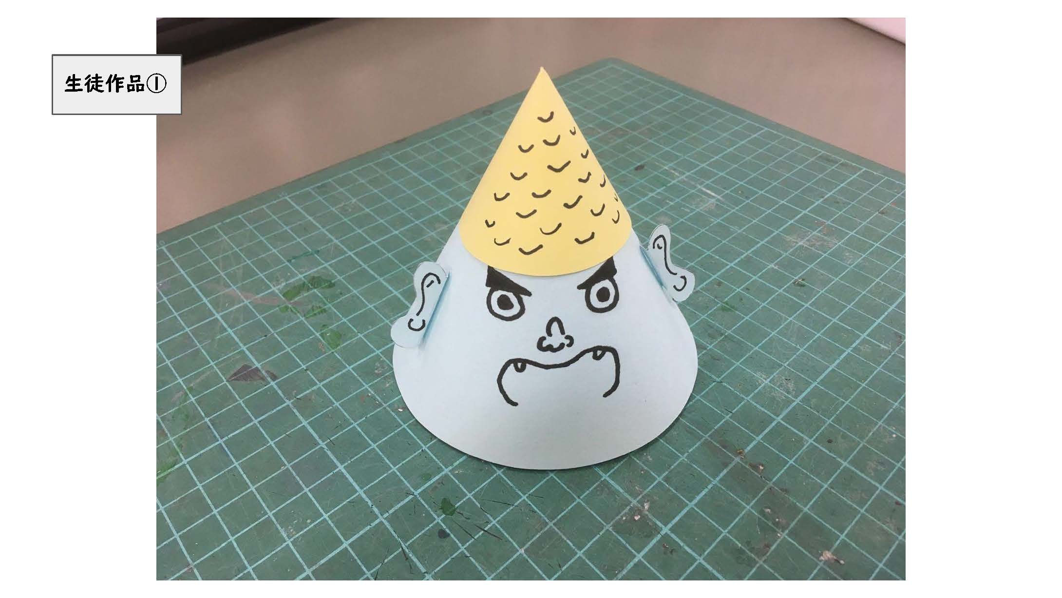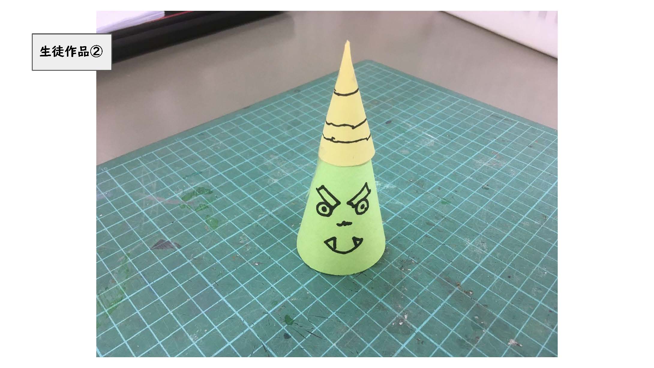 1年生 空間図形 ~ 円錐鬼を作ろう ~ 「円錐鬼」の実践を行おうと思った経緯 ・空間図形の単元では「立体を触った経験の差」によって理解度が大きく異なると感じている。なるべく実物を触る機会を多くしたい。 ・円錐を扱う授業では、「クリスマスツリー」などを作る実践(お茶水大教材・論文データベース藤原教諭実践を参考)がある。先行実践と同様に、作ったものが何かに活かせるとよいと考えた。また、空間図形を指導する時期にあわせたものにしたい。 ・円錐の展開図を描かせると、側面を三角形にしてしまう生徒が多い。三角形では円錐を作れないということを体験をもって学ばせたい。 ・単純な円錐ではなく、2つの円錐を組み合わせるなど活動が充実したものになるようにしたい。 ・平面図形と空間図形の単元のつながりを演出したい。