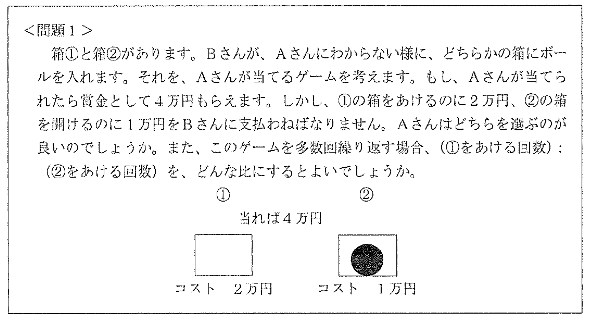数学の学習において重要なのは、学習に対する意欲である。意欲を高めるためには、与えられた課題が生徒にとって魅力を持っている必要がある。数学学習において導入に用いられる課題は、学年が進むにつれ「数学らしい」ものが多くなる。身近な現象でありながら、数学の良さを多く持ち、数学を活用して解決するという課題はなかなか見つけにくいものである。そこで、ジャンケンによるゲームや身近な競合場面を題材にして、経済学などで使われているゲーム理論のアイディアにより問題を解決するというのがこの授業の流れである。ゲーム理論は数学の研究対象でもあり、そこで用いられている数学はなかなか興昧深いものである。その数学を中学・高等学校の数学を活用する形で解決し、数学活用の価値と数学の面白さを昧わってもらおうというのがこの授業の根底にあるコンセブトである。なお、この授業の対象生徒は中学1年~3年生である。