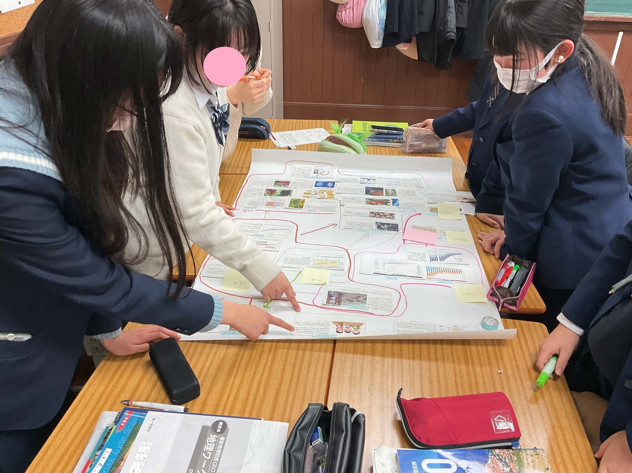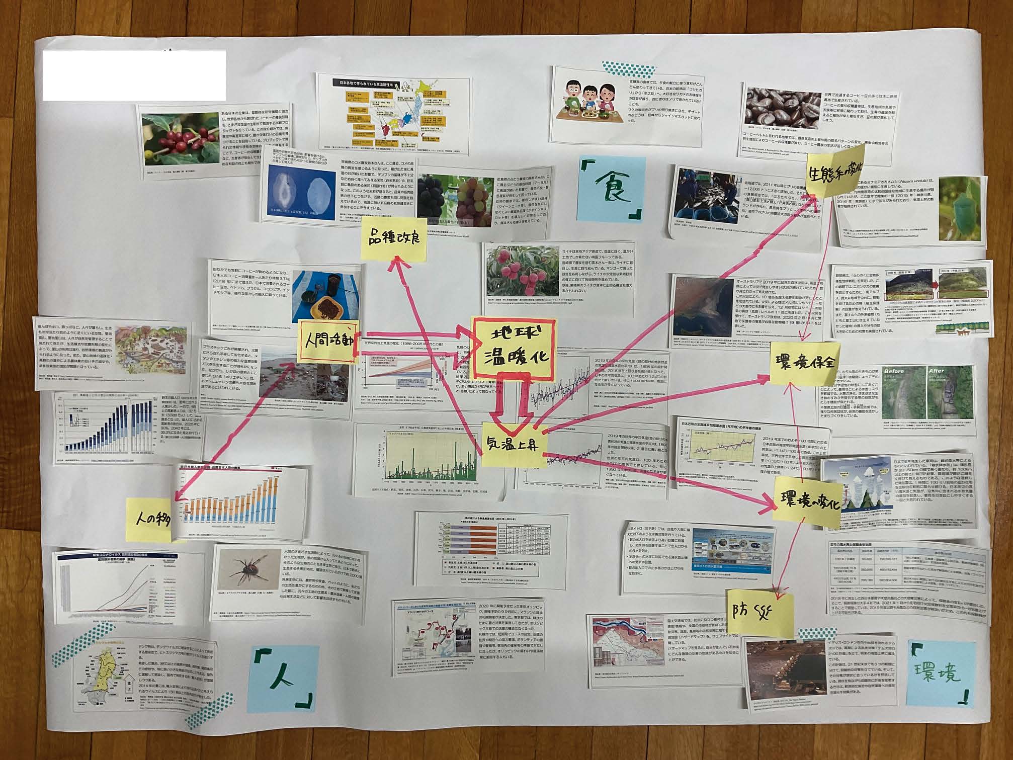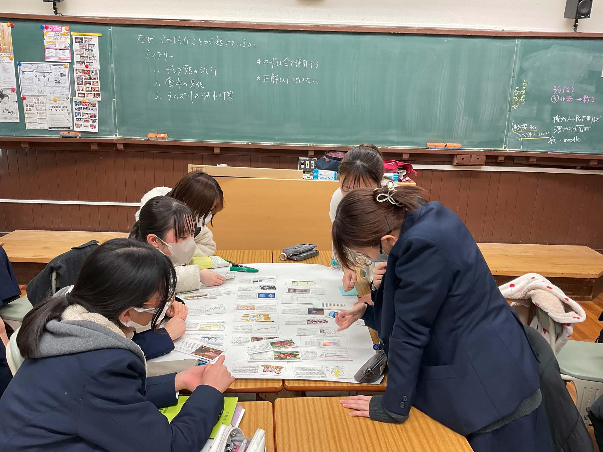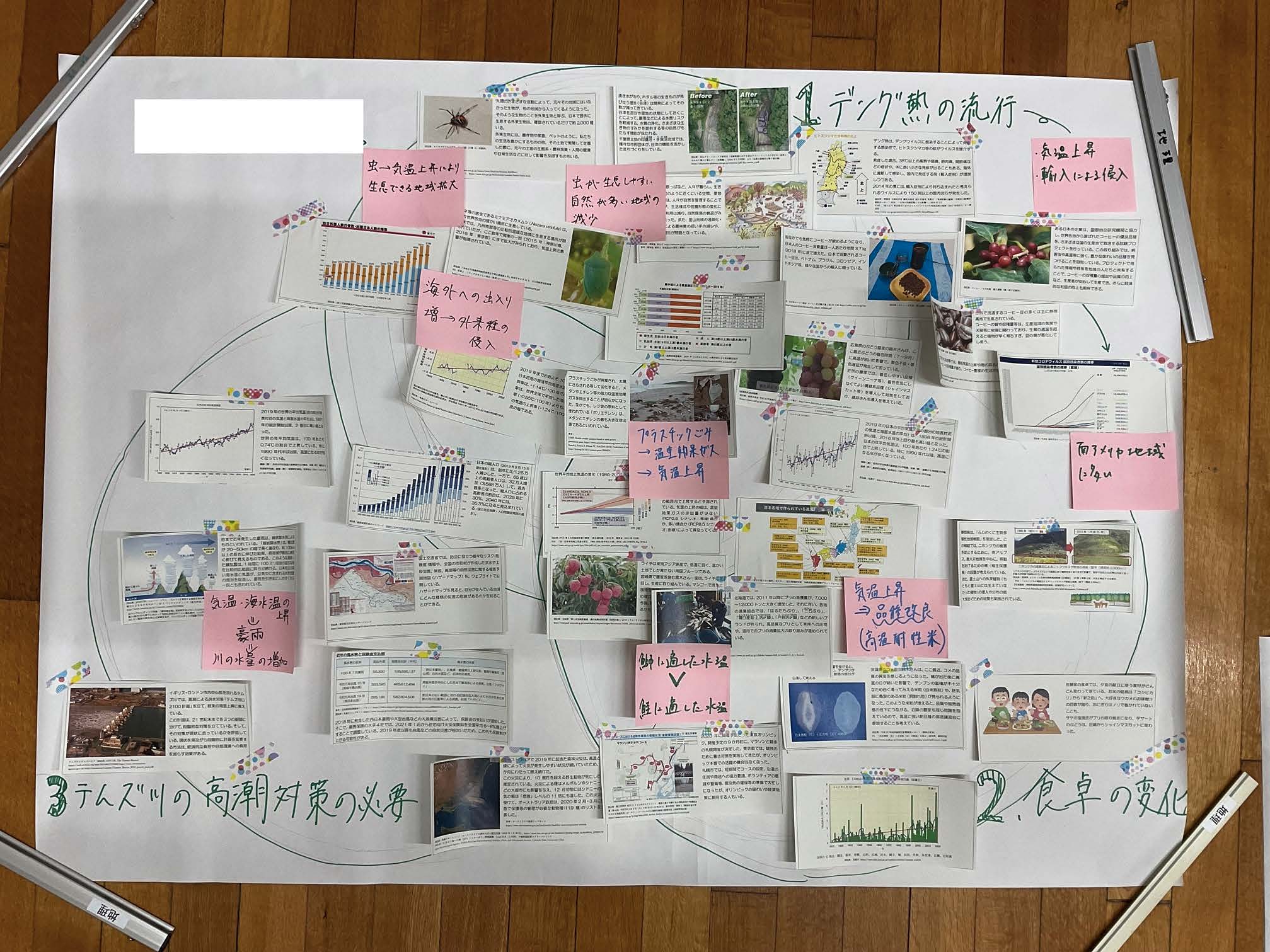 本報告は、高等学校「地理総合」における単元「地球的課題と国際協力」の授業実践として、国立環境研究所が作成した「気候変動対応のミステリー」を教材に用いたアクティブラーニングを取り上げている。生徒はデング熱の流行、家庭の食卓の変化、ロンドンの洪水対策という三つの事象を題材に、20 枚以上の情報カードをグループで論理的に並べ替え、ポスターにまとめて発表した。ここでは「正解は一つではない」という前提のもと、多角的な思考と協働的な探究が促された。