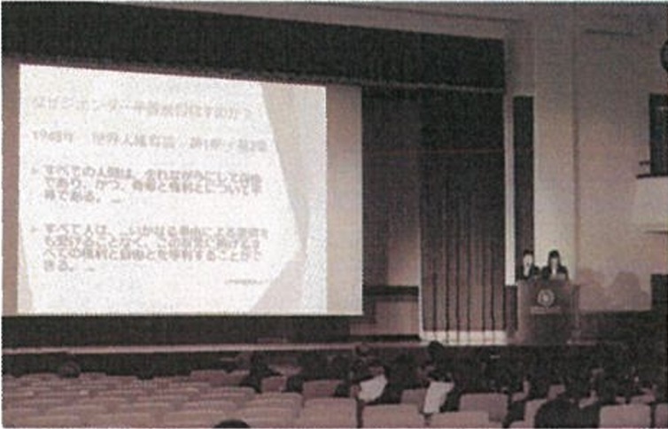 本校の SGH の取り組みの1つに、高校2年生を対象とする「国際関係と課題解決」講座がある。貧困や平和,人権に係るグローバル社会における諸課題が発生する背景・要因について考察し,その解決のための具体的方策について探究する活動を通じて,グローバルな視野と課題解決力を有する人材の育成を目指すことをねらいとしている。ここでは、平成29年度の成果発表会の様子を報告する。