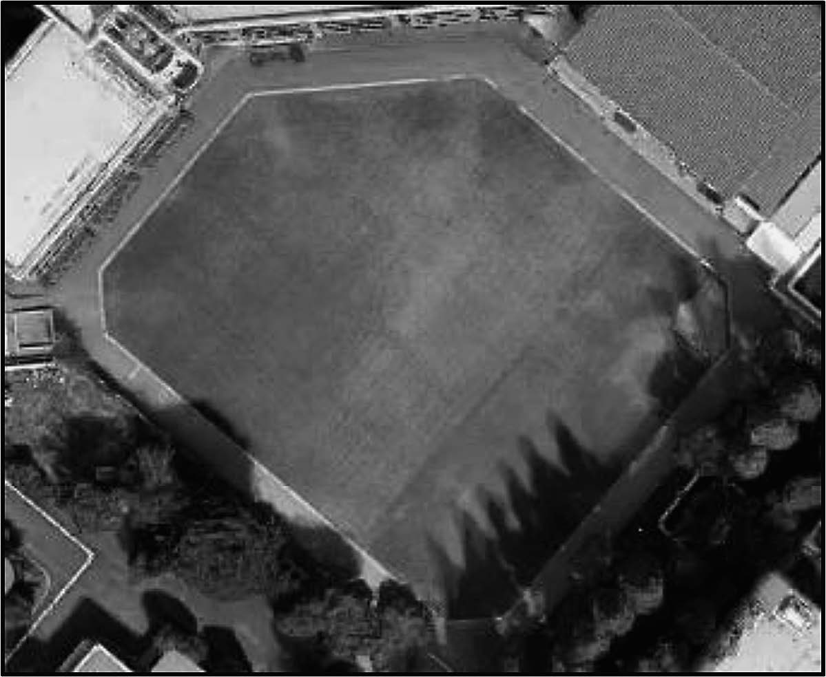 そこで,本単元では「校庭(芝生部分)の面積」を,既習の長方形・正方形の求積方法を用いて考えていく。本校の校庭は歪な八角形をしていることから,子どもたちは解決の見通しとして,直角三角形を付け足し,校庭全体を長方形とみて求積していくことが予想される。本時では,この見通しをもとに,直角三角形の求積方法を考え,校庭(芝生部分)の面積を求めていく。