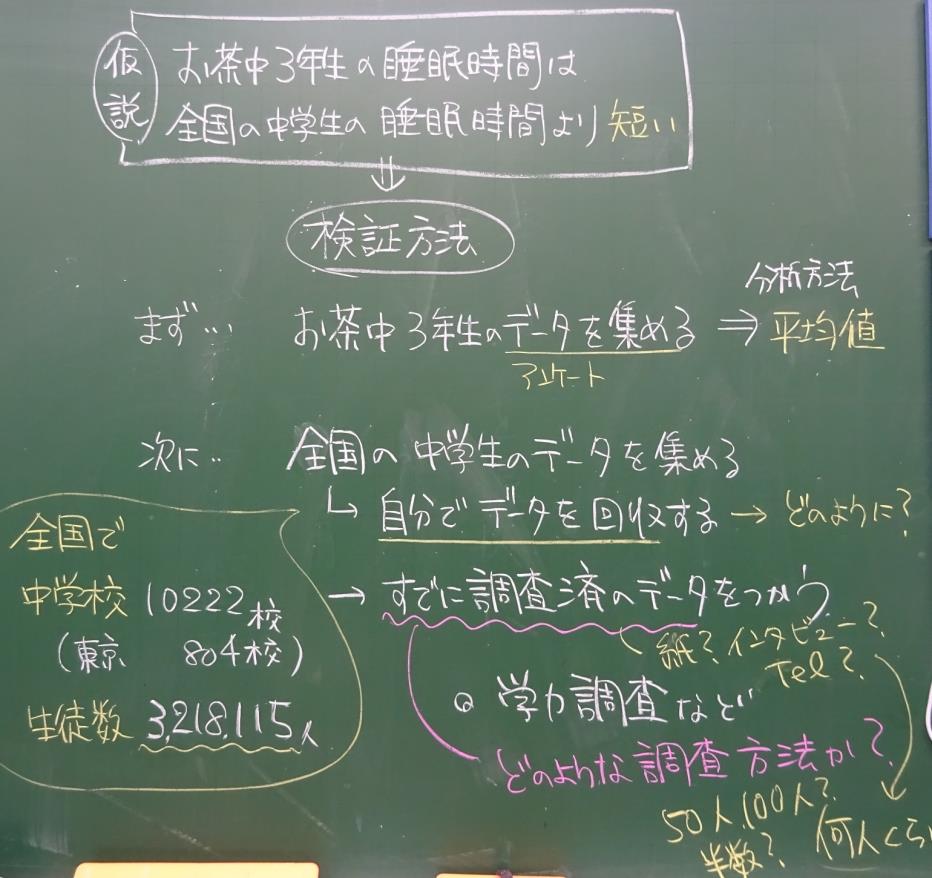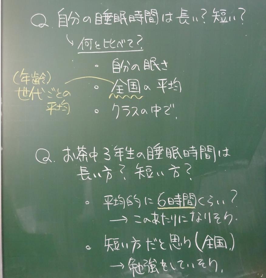 ・お茶中3年生の睡眠時間が全国の中学3年生の睡眠時間と比べて長いか短いか予想する