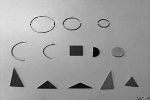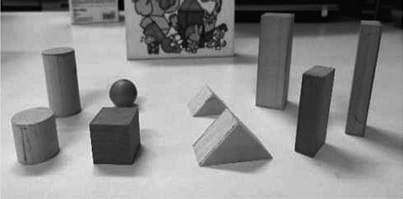 実際に身の回りにあるものの形は,多様であるのでこの場に全てを持ち込むことは難しい。そこで,積み木だけでなく,色・素材な様々なものが含まれているフレーベル12の恩物からいくつかの模型を使ってみることにした。ここでは,恩物がもつ意味と価値という点を考慮するのではなく,素材や形が多様である,また,子どもにとって扱いやすい大きさであるという点を取り入れ扱うことにする。