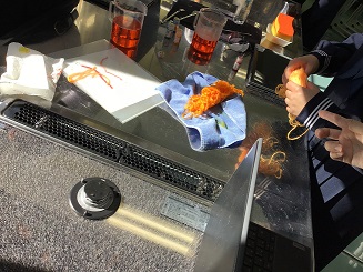 完成した毛糸は、昼休みの時間に幼稚園の代表の子どもたちが中学校の中庭にやって来て、色とりどりの毛糸を中学生から受け取った。後日、クリスマスが近付いていたため、幼稚園の玄関にある大きなもみの木に吊るす飾りやドリームキャッチャーを作ったという写真を受け取った。幼稚園から受け取った写真の様子は、はじめに幼児から受け取った手紙にはない楽しみ方であったため、幼児の希望を叶えることができなかったのではないかと戸惑った中学生も少なくはなかったはずである。しかし、中学生が染めた毛糸を手に取った幼稚園の子どもたちがその時一番やってみたい方法で毛糸遊びを楽しんでくれたという嬉しい事実は、中学生にとって貴重な学びの場であった。