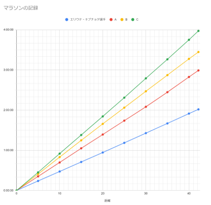 4人のマラソンランナーがコース上ですれ違うことがあるかどうか、すれ違うのであればどのあたりであるかを検討する。