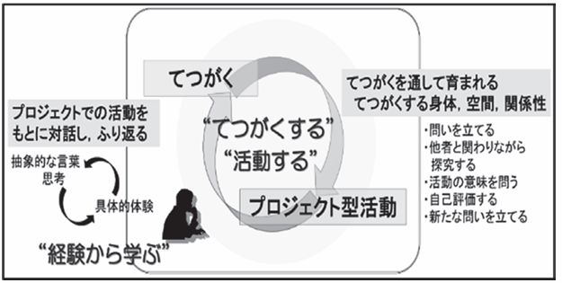 プロジェクト型活動(以下,PJ)とてつがくから成る「てつがく創造活動」は,3年生から設定されているが,低学年における学びをボトムアップに見とりながら,一人ひとりの“やってみたい”,“考えてみたい”という思いをもとに活動をつくっている。
