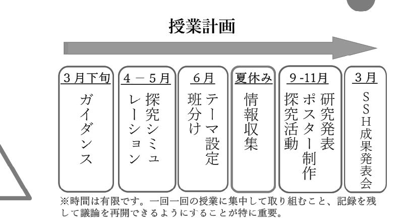 - 知の統合をはかる―3年必修授業:持続可能な社会の探究(総合的な探究の時間)―(2021年度 高校研究紀要 第67号) 知の統合をみとる―3年必修授業:持続可能な社会の探究(総合的な探究の時間)―(2022年度 高校研究紀要 第68号) 第26回公開教育研究会報告「SSH学校設定科目 持続可能な社会の探究(総合的な探究の時間)―生徒と参観者がともに課題を探究するポスターセッション―」(2022年度 高校研究紀要 第68号)