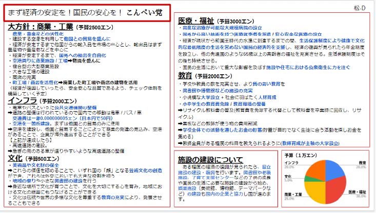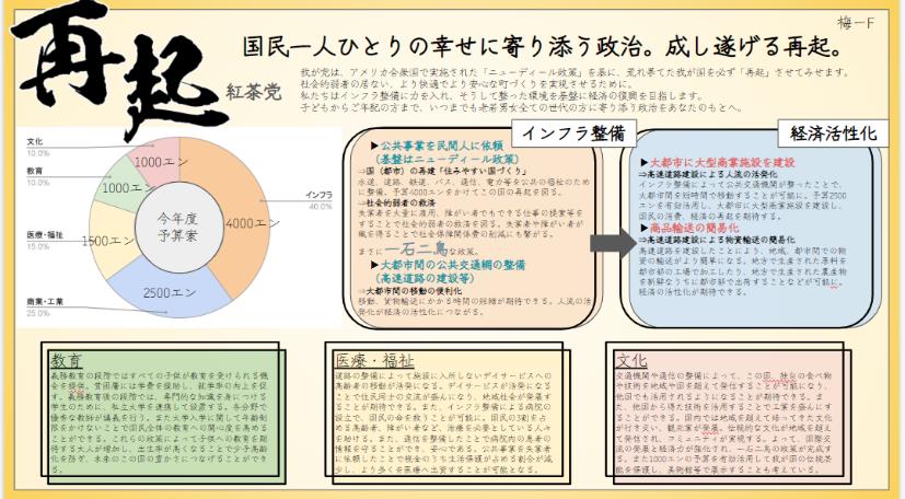 このような考えに基づいて構想したのが架空の政党を立ち上げ政権公約をつくり相互に 投票する機会を取り入れた授業である。生徒たちは最初に現実の政党の政権公約を読み合い各政党がどのような点に力を入れているか比較した。次に自分たちで政党をつくり 政党ごとに党首や政党名を決め、国の5つの課題を解決するために、どこに重点を置くべきか大方針を定めた。各政党は大方針に基づいて予算を5つの課題に配分し、円グラフで予算案を示した。また、その予算案に基づいて課題ごとに政権公約を作成し、1枚のスライドにまとめた。そして学年全員でGoogle Formsを通して支持したい政党を選ぶ模擬投票を行った。また、5つの課題に対する政権公約に対しても投票を行い、各部門の最多得票獲得公約も同時に選出した。さらにそれぞれの選出理由についても一緒に提出することとした。